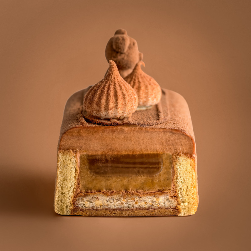 Mousse chocolat lait, crémeux noisette et caramel noisette.